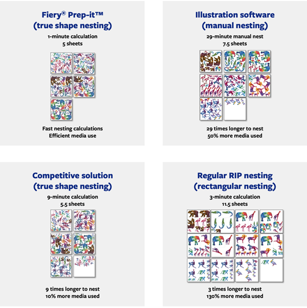 - Fiery Prep-it 拼版使用的承印材料更少,花费的时间更少,可以提升打印机产能